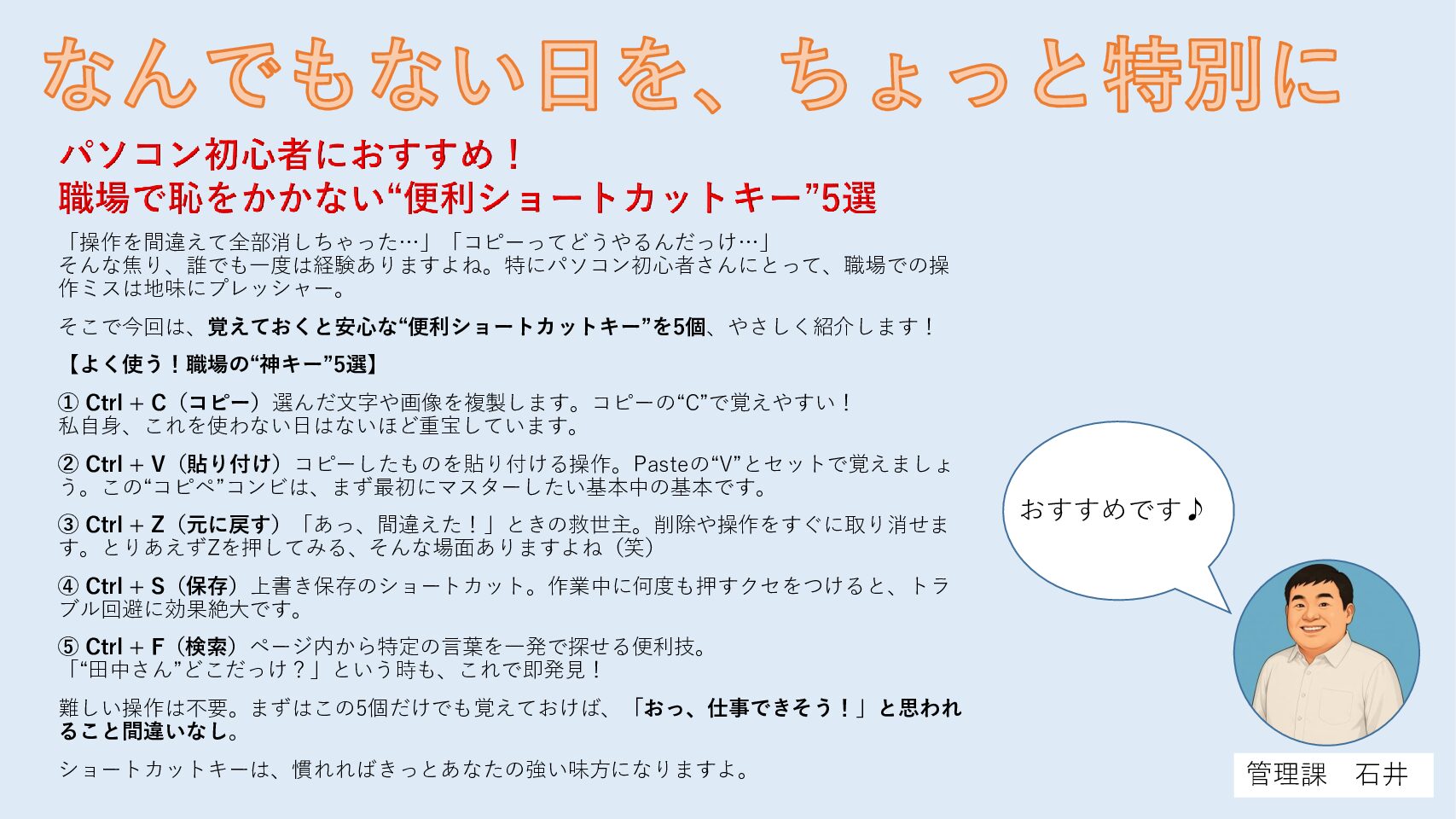 こんにちは、管理課の石井です。いつも「なんでもない日を、ちょっと特別に」をご覧いただきありがとうございます。