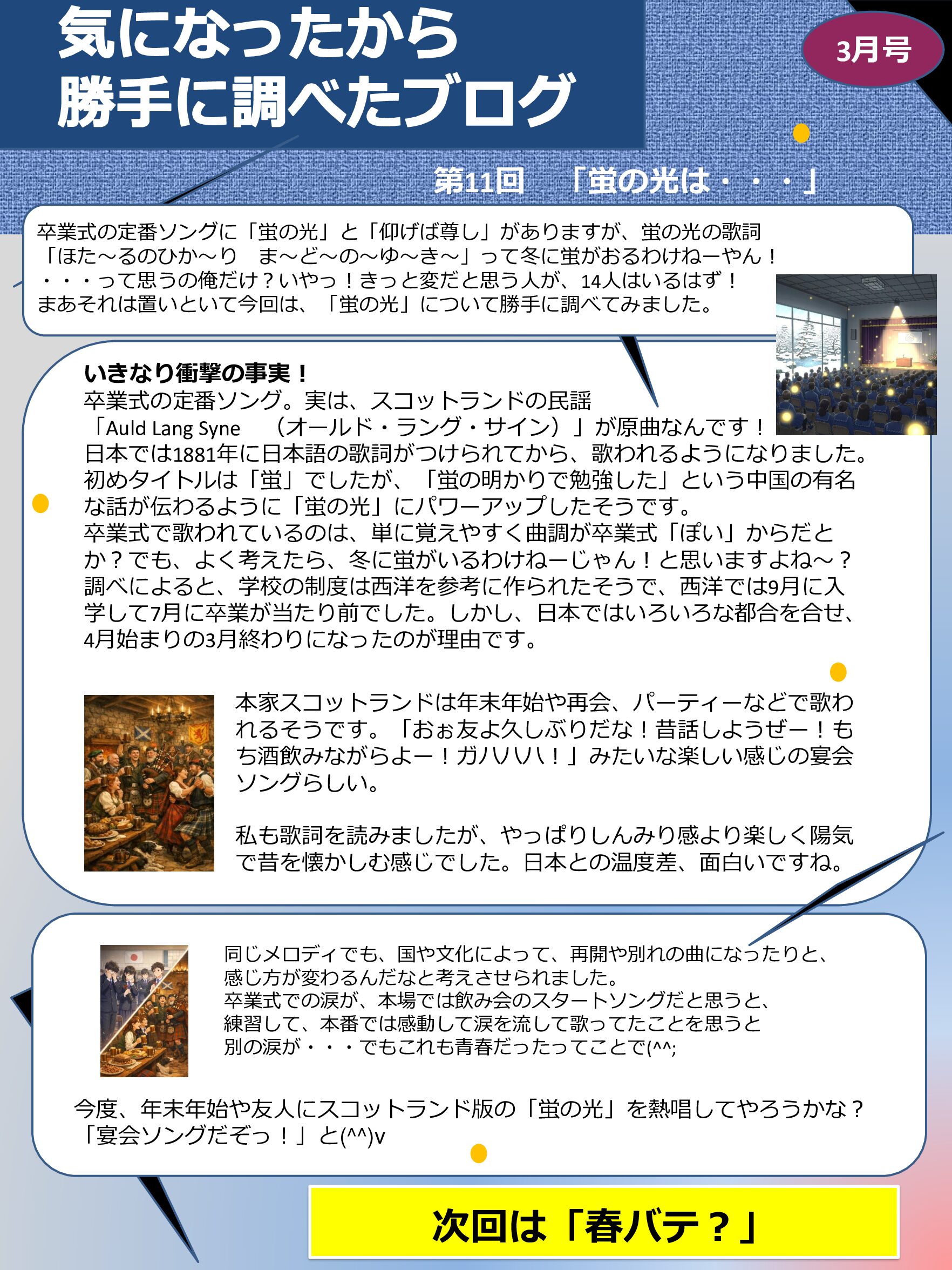 今回は卒業ソングの定番「蛍の光」を勝手に調べてみました。なぜ夏の虫が冬の曲に登場するのか?調べてて昔は外国の影響うけまくり?だったんだな~としみじみ思いました。